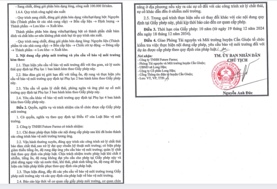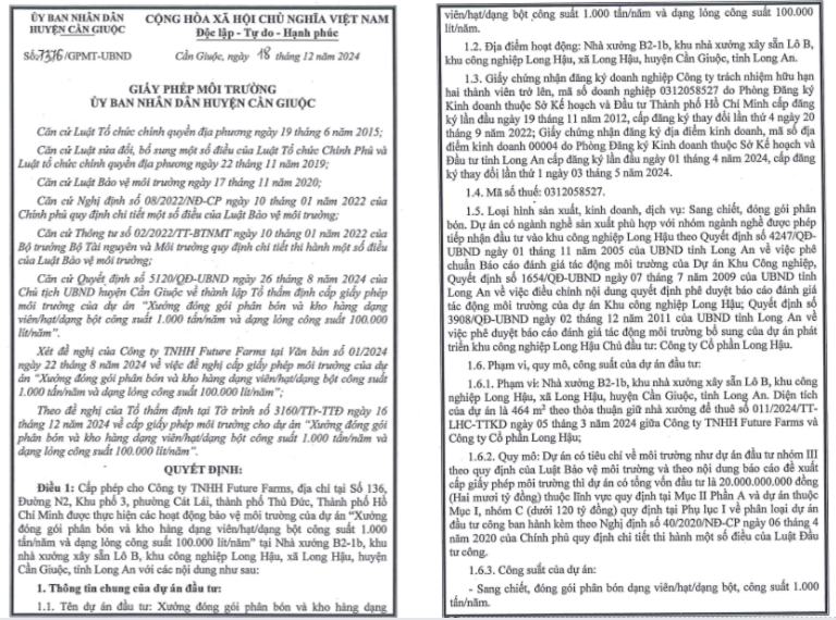 Ngày 18/12/2024, Cty Future Farms đã được UBND HUyện Cần Giuộc, Tỉnh Long An cấp Giấy phép Môi trường theo quy định của Luật bảo vệ môi trường. cho Xưởng đóng gói phân bón và kho hàng dạng viên/ hạt/ bột công suất 1.000 tấn/ năm và dạng lỏng công suất 100.000 lít/ năm có địa chỉ tại Nhà xưởng B2-1B, khu nhà xưởng xây sẵn lô B, KCN Long Hậu, Xã Long Hậu, Huyện Cần Giuộc, Tỉnh Long An. Đây là một dấu mốc quan trọng, khẳng định cam kết mạnh mẽ của công ty trong việc hoạt động sản xuất – kinh doanh gắn liền với trách nhiệm bảo vệ môi trường và phát triển bền vững.